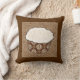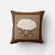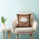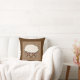 fosco de cupcake e tocado com coco raspado, em um invólucro decorativo de cupcake com formato de papel de parede, de cor castanha e branca, sobre um travesseiro decorativo de fundo branco e creme, de cor castanha