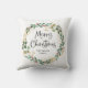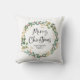 Este travesseiro de Natal simples e na moda apresenta uma coroa estonteante de aquarela com folhas verdes e falsas de ouro e groselhas vermelhas, e uma tipografia moderna preta que diz "Feliz Natal" em um fundo branco.