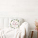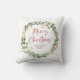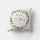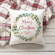 Este travesseiro de Natal simples e na moda apresenta uma coroa estonteante de aquarela com folhas verdes e falsas de ouro e groselhas vermelhas, e uma tipografia vermelha moderna de roteiro que diz "Feliz Natal" em um fundo branco.