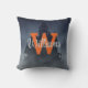 Add a spooky touch to your home decor during Halloween with this throw pillow featuring a misty haunted house, flying spooky bats, and personalized in the center with a big bold orange initial and your family name. A perfect accent for spooky season, this gothic-style cushion adds haunted charm to your couch, entryway, living room, or guest room throughout October and the fall.