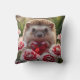 A cute hedgehog holding a red garnet heart sits in a patch of red and white carnations.