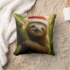 A cute sloth in a Santa hat clings to a mossy tree branch as sunlight streams through the vibrant jungle foliage surrounding it