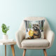 Sweet Christmas throw pillow with a sweet watercolor raccoon holding a gold ornament sitting in a snowy forest.