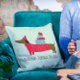 Dachshund Through The Snow Cute Christmas Dog Fun Travesseiros decorativos apresenta um belo e caprichoso espetáculo de carregando de cão Dachshund com o texto "Dachshund through the snow" na escrita moderna. Projetado por feriados do Evco www.zazzle.com/store/evcoholidays