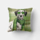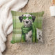 A Dalmatian makes a cute dog lover pillow with the black and white pup wearing green sunglasses and a cool matching scarf while standing against a great sage green plaid. A great gift for anyone and perfect for dorms, office, living room and bedrooms.