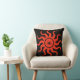 Este travesseiro decorativo apresenta um desenho abstrato e selvagem de um sol vermelho dançante sobre um fundo preto puro. Os raios estilizados parecem dançar ao redor do centro negro. A design é repetida atrás.