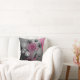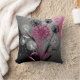 Desenho de dandelion rosa, branco e preto em uma almofada de sofá com fundo preto, prata e rosa.
