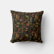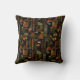 Sophisticated mid-century geometric pattern throw pillow featuring layered circles, arches, triangles, and rectangles in forest green, burnt orange, ochre, and cream on a black background. Rich textures and retro-modern shapes create a bold design ideal for Bauhaus lovers, vintage décor fans, and anyone drawn to moody modern style.