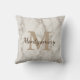 Travesseiro decorativo de mármore branco bonito, elegante, e refinado do impressão que caracteriza uma letra do monograma do taupe, os nomes do casal no roteiro, e sua data do casamento na parte dianteira. A parte traseira do travesseiro tem uma letra do monograma e o nome de família no roteiro.
