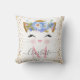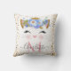 Almofada com monograma de princesa gata da moda. Lindo rosto de princesa gata em rosa dourado, rosa bege e glitter dourado, nariz em forma de coração rosa e cílios pretos grandes, com uma coroa e arranjo floral azul, tons rosa bege e dourados. Nas laterais, confetes faiscantes em rosa dourado falso. Fácil personalização para adicionar seu nome e monograma à almofada.