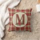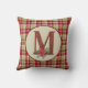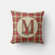 Almofada de lançamento festiva tem um fundo xadrez com monograma de madeira de celeiro rústico preenchido com a letra M e enfeite floral de poinsettia aquarela. Paleta de cores de férias country.