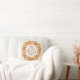 Travesseiro que diz, "Dê aos Obrigados um Coração Grateful" em uma letra manuscrita, cercada por uma abóbora e coroa de folhas. O fundo tem um aspecto sutil gravado.