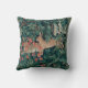 Uma almofada de tapeçaria vintage com uma imagem de coelhos numa floresta.