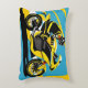 Ilustração vibrante com um motociclista a montar uma moto amarela elegante contra fundo arrojado. A design enfatiza velocidade, estética moderna e paixão automotiva, ideal para temas de motos e conceitos de corrida.