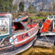 Um design de arte de velhas lanchas amarradas no canal esperando a restauração.