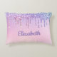 Travesseiro de quarto de uma garota bonita com falso arco-íris pingando brilho contra um fundo rosa. Personalize com seu nome em roxo.