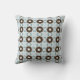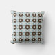 A decorative pillow featuring a symmetrical geometric pattern with blue, white, and brown hues shown from the front and back on a gray background.