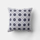 A decorative pillow featuring a symmetrical geometric pattern with blue, white, and brown hues shown from the front and back on a gray background.