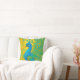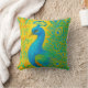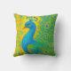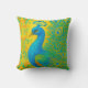 Este elegante travesseiro decorativo de pavão artístico vai iluminar sua decoração com o pássaro em cores de turquesa e azul em um fundo de padrão amarelo. Imagem gerada com IA.