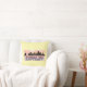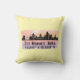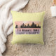 O travesseiro decorativo apresenta a silhueta do horizonte de linha do horizonte da cidade de Des Moines IA com as coordenadas de escala de cor da água e de mapa de latitude e longitude no fundo do creme.