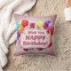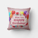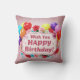 Um travesseiro decorativo aconchegante e alegre, com a frase "Deseje Seu Feliz Aniversário" em letras vibrantes e ousadas. A design apresenta um arranjo festivo de balões coloridos, fitas e flores contra um fundo rosado macio com efeito de boque suave. Este travesseiro decorativo adiciona um toque de celebração e alegria a qualquer cenário de aniversário!