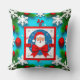 Um cartão de Natal vibrante mostrando Papai Noel, rodeado por ornamentos festivos, pinças e flocos de neve em um fundo azul com alegria de férias.