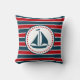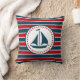 Design náutica com decoração de embarcações à vela em forma redonda com estrelas sobre fundo listrado vermelho, azul e branco