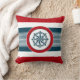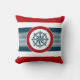Design náutico com decoração em forma de bússola, em fundo listrado a azul, vermelho e branco