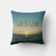 Deus é bom Travesseiros de citação. Citações/mensagens cristãs inspiracionais e motivacionais para travesseiros decorativos. Esta design apresenta um design de praia com o tema da praia (pôr do sol sobre o oceano) com uma tonalidade azul para uma sensação retrorreflectora inspirada, fazendo a citação, "Deus é bom".