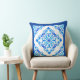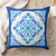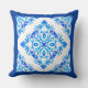 Este belo travesseiro apresenta um design que se parece com um azulejo de porcelana azul. Uma borda azul enquadra o travesseiro e o verso é um azul real sólido.
