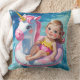 Uma menina bonita caminha gentilmente num flutuador de unicórnio rosa e branco, deslizando através de uma piscina de natação azul e cristalina.