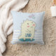Um travesseiro com um dinossauro sorridente, bochechas rosadas cor-de-rosa e RAWR escrito em sua barriga. 3 estrelas felizes coloridas acima de sua cabeça. Colocado sobre um padrão de bolinhas e listras azul-claro e branco.