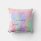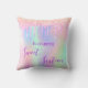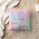 Um travesseiro para um quarto de meninas de 16 anos. Um arco-íris de tendência, fundo holográfico em roxo, rosa, rosa e verde de menta. Derramamento de brilho, pingos de tinta. O texto: Doce Dezesseis é escrito em roxo com um grande estilo escrito à mão moderno. Personalize e adicione um nome.