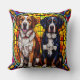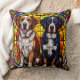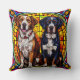 Trabalho de arte de vidro colorido colorido, que representa dois cães sentados sobre um fundo geométrico vibrante, com detalhes intrincados e iluminação radiante.