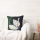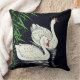 Travesseiro decorativo em uma ilustração japonesa vintage em dois cisnes nadando e refletiu em uma piscina em um branco dramático sobre a composição negra