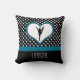 Preto e branco e azul. Um travesseiro decorativo cheerleading elegante, customizável, adiciona seu nome! Caracteriza um cheerleader em um coração azul.