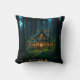 Travesseiro decorativo de um castelo Elven pacífico Tolkienesque em uma floresta serena por um lago ao anoitecer. Luzes de fada iluminam os arredores. A imagem foi feita com Leonardo.ai.