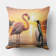 Uma cena surreal capturando um flamingo e um pinguim lado a lado, lançando longas sombras em uma frente d'água sombria no pôr do sol.