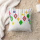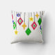 Este travesseiro decorativo tem uma coleção de ornamentos pendurados em formas de diamante, círculos e estrelas.