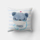 Um travesseiro com uma ilustração fofa de um urso azul vestindo um chapéu de enfermeira com um pequeno coração nele. Também vestindo uma máscara protetora e tem um estetescópio azul.