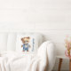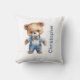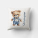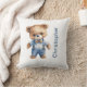 Um urso de pelúcia adorável vestido com uma roupa azul neste travesseiro decorativo para bebês no berçário. Personalize-o com o nome dos bebês ou qualquer texto.