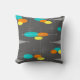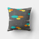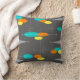 Travesseiro moderno do meio século em esferas e em triângulos da era espacial com linhas de cruzamento. Azul, alaranjado brilhante e amarelo em um fundo cinzento escuro.