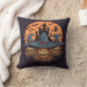 Três espantalhos esculpidos com medeiros maliciosos sentam-se debaixo de uma lua assombrante, cercados por morcegos e um castelo sombrio no fundo, evocando o espírito do Halloween.