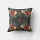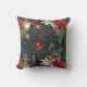 Um travesseiro decorativo de decoração de inverno de Natal que apresenta um fundo noturno de floresta florestal de floresta com flocos de neve de ouro, poinsetos, lanternas, pinos cones e bagas vermelhas com um ornamento de bola vermelha em queda de fita vermelha. Os lados frontal e traseiro são cortados de forma diferente.