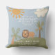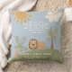 Um belo travesseiro de viveiro cristão com uma selva, a cena ilustrada de um leão, palmeiras, sol e nuvem. O verso bíblia tirado de Luke 2:40 é editável. Personalize com as estatísticas de nomes e natalidade da criança em branco. Faz um novo excelente de presente de nascer.