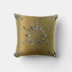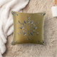 Uma elegante almofada de Natal com um padrão de estrelas prateadas que se assemelham a flocos de neve prateados num fundo de ouro de um lado, com um padrão de estrelas douradas em flocos de neve sobre prata no lado oposto.