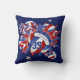 O travesseiro decorativo de vôlei desta menina divertida apresenta uma "explosão" de vários tamanhos, volicbolas vermelhas, azuis e brancas e formas vermelhas, azuis e brancas em um fundo azul mais escuro e personalizável - os painéis vermelho e azul dos volleybolas são misturados com um padrão caleidoscópico floral - personalizam com o nome do atleta e o número de camisola na frente e trás - katz_d_zynes