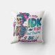 Design vibrante e colorido com um esqueleto feminino tomando café. O texto colorido diz: "Eu digo muito IDK, mas confie em mim, eu sei". Esse design está disponível em uma grande variedade de produtos.