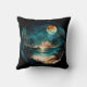 Uma pintura decorativa de paisagem aquática de uma praia com palmeiras após o pôr do sol.