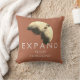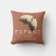 "Expanda seus horizontes" é, muitas vezes, o melhor curso para se desprender e avançar. Também pode levar à descoberta de um potencial e oportunidades maravilhosos em sua vida e em você mesmo. De um lado do travesseiro, esta mensagem encorajadora e inspiradora aparece em letras claras sobre um fundo laranja ferrugem para um design abstrato tipo sepia em marrom escuro, amarelo pálido e bronzeado. Por outro lado, o design sem palavras, também num fundo laranja feroz.